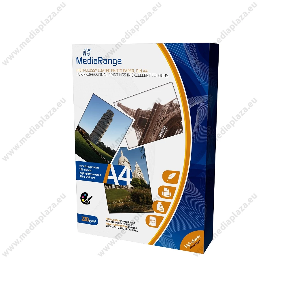 Tintasugaras nyomtatókhoz optimalizált 21x29,7cm A4 méretű 220g/m2 tömegű fényes felületű MediaRange MRINK103 fotópapír, mely alkalmas különböző brosúrák, prospektusok készítésére, családi fotók kinyomtatására egyaránt. A nagyfelbontású fényes felület garantálja, hogy a kinyomtatott minta élénk színű és pontos lesz. A speciális hordozó felület elősegíti a felvitt nyomat gyors száradását, és hosszan megőrzi a vibrálóan élénk színeket. A gazdaságos 100 darabos kiszerelés nagyon jó ár-érték arányt biztosít. A csomag tartalma 100db 21x29,7cm A4 méretű 220g/m2 tömegű fényes MediaRange MRINK103 fotópapír.