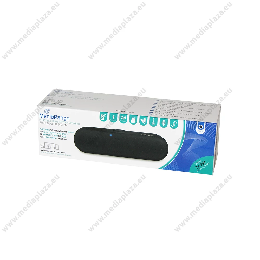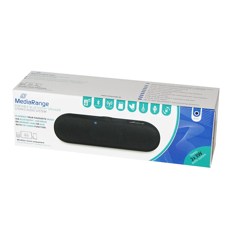 Beépített 1200mAh kapacitású Li-ionos akkumulátorral szerelt kisméretű alumínium-házas vezeték nélküli sztereó bluetooth hangszóró, mellyel könnyedén feldobható a hangulat egy szabadtéri programnál vagy utazáskor. Kompakt méretének köszönhetően egyszerűen szállítható, így bárhol és bármikor használhatja. Bekapcsolt állapotáról LED kijelzés ad tájékoztatást. Gyorsan és egyszerűen párosítható telefonjához vagy táblagépéhez, valamint beépített FM-rádió tunerének köszönhetően rádióhallgatásra is alkalmas. A mellékelt AUX kábel segítségével csatlakoztathat hozzá más eszközöket is, amelyek nem bluetooth-képesek. Lehetőség van saját memóriakártyáról vagy USB pendrive-ról MP3 formátumú zenei anyagok lejátszására is, mivel a hangszórón kialakításra került egy microSD és USB aljzat is. A beépített nagy teljesítményű akkumulátor 4,5-6 órányi zenehallhatást tesz lehetővé. Hangteljesítménye sztereó 2x3W. Mobiltelefonnal összekapcsolva bluetooth-kihangosítóként is használható. Méretei: 190 x 55 x 60mm, tömege 385 g. A csomag tartalma: 1db fekete színű MediaRange MR734 Bluetooth hangszóró beépített mikrofonnal, valamint egy USB/microUSB töltőkábel és egy 3,5mm jack-jack AUX kábel.