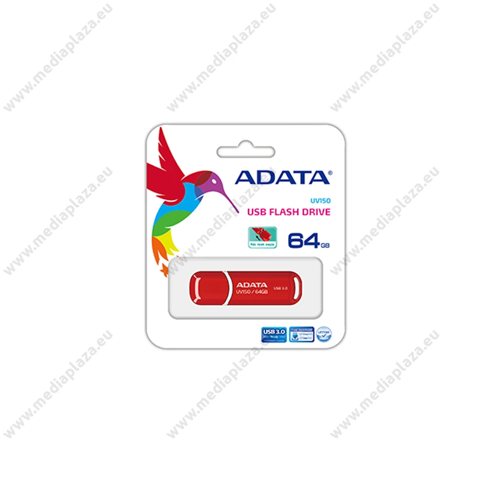 Klasszikus vonalvezetésű zárókupakos kialakítású adathordozó, mely megfelel a legmodernebb eszközökkel szemben támasztott adatátviteli követelményeknek. Az Adata UV150 Classic USB 3.0 pendrive támogatja a „SuperSpeed” szabványú adatátvitelt, ezért használatával időt takaríthat meg. A biztonságos adattároló snap-On zárókupakkal lett ellátva, így az használat közben átrakható a pendrive másik felére, csökkentve az elvesztés lehetőségét. Adatai biztonságáért fényes felületű nagy keménységű műanyag burkolat felel, mely jól ellenáll a napi használatból eredő mechanikai hatásoknak és karcoknak, valamint az ujjlenyomatoknak. Segítségével biztonságosan tárolhatja, szállíthatja és megoszthatja digitálisan tárolt adatait, filmeket, zenéket, digitális fényképeket és dokumentumokat. Visszafelé kompatibilis, ezért USB 2.0 interfészen is hibátlanul működik. Kompatibilis a jelenleg használt operációs rendszerekkel. A csomag 1db 64GB kapacitású Adata UV150 Classic USB 3.0 pendrive-ot tartalmaz piros színben.